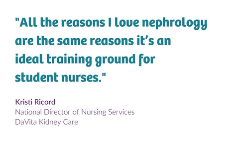 Amid a serious national nurse shortage, Ricord and her colleagues in DaVita’s nursing leadership team are convinced that the field of nephrology has a special role to play in inspiring and training the next generation. “All the reasons I love nephrology are the same reasons it’s an ideal training ground for student nurses,” Ricord asserts. She also notes that unlike some specialties that are reliant on large urban hospital systems, dialysis happens everywhere. “When we think about involving the DaVita clinical network in student nurse training, we also see possible benefits for both patients and the medical workforce in rural communities. The vision makes sense on so many levels.”